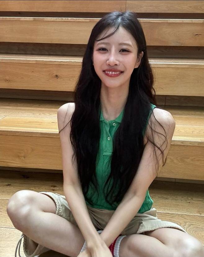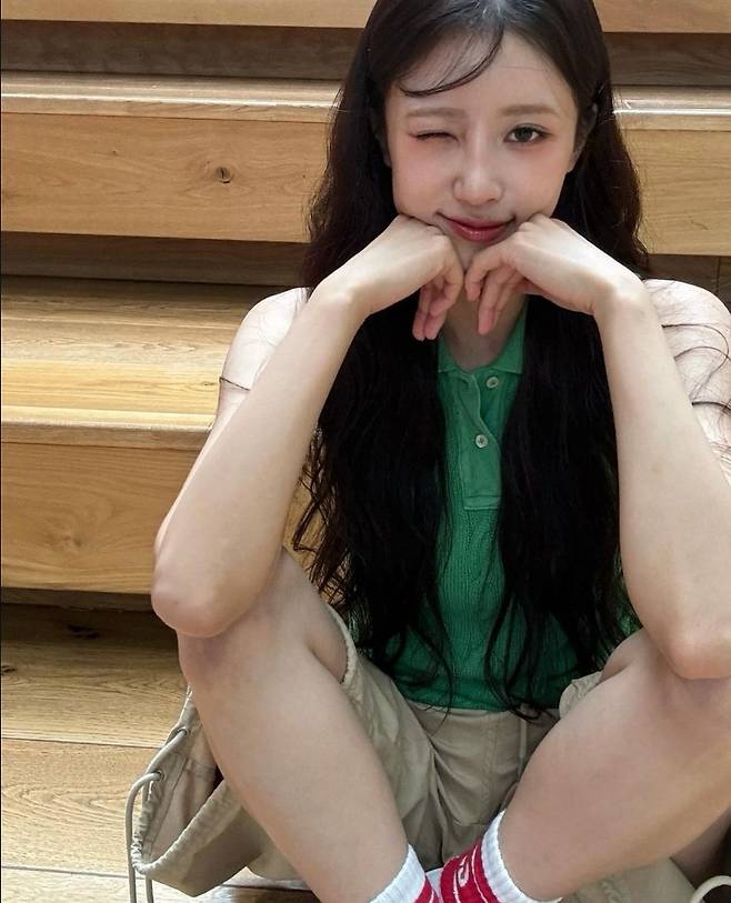이미주는 초록색 민소매 니트를 착용해 산뜻하고 러블리한 분위기를 자아냈습니다.