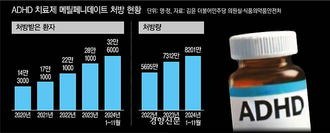 국회 보건복지위원회 소속 김윤 더불어민주당 의원실이 식약처에서 받은 ADHD약(메틸페니데이트) 처방 현황을 보면, ADHD 약물 처방환자는 2020년 14만3000명에서 지속적으로 증가해 2024년(1∼11월) 32만6000명으로 최근 5년 새 2.3배가 됐다.