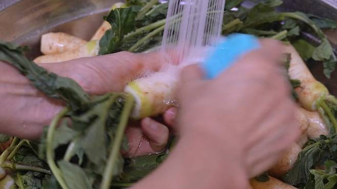 총각무를 물에 깨끗이 씻어 주세요. 이때 식용 솔을 이용해 문질러 닦아 주세요. 그러면 무 사이에 낀 흙을 제거하기 훨씬 더 쉽답니다.