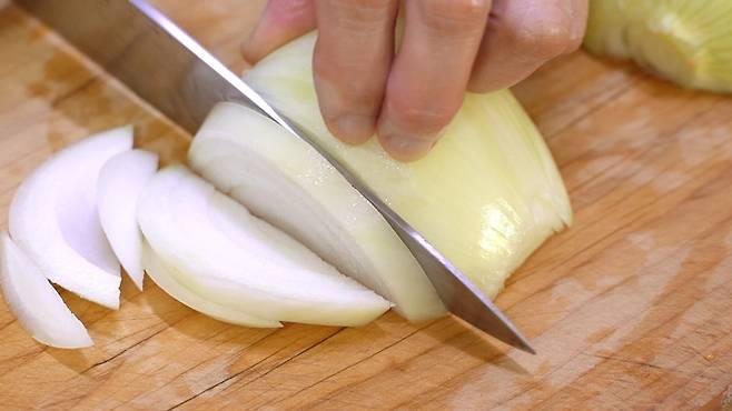 쪽파는 반으로 자르고, 양파는 채 썰어 주세요.