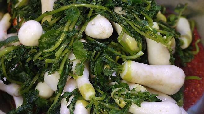 이제 숙성된 양념장과 물기가 제거된 총각무를 양푼에 넣고 버무려 주세요.