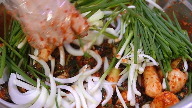 한번 버무렸다면, 쪽파, 양파를 넣고 다시 한번 버무려 주면 완성!