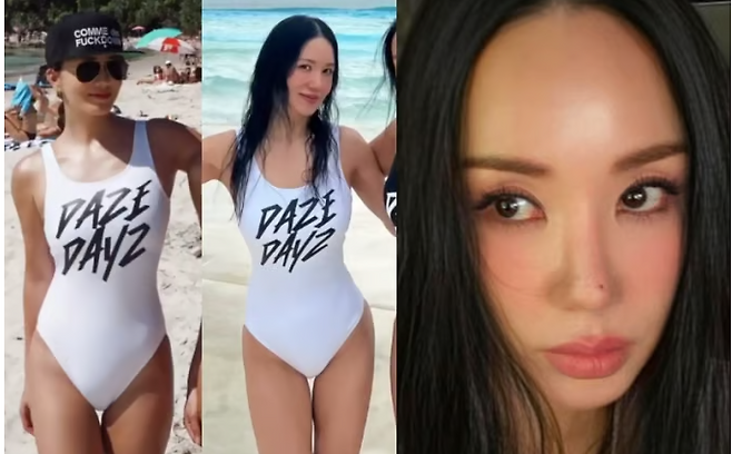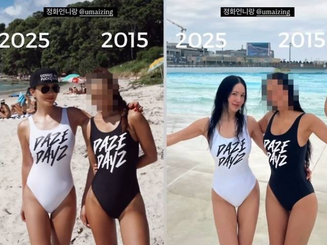 2025년, 해변에서 2015년과 똑같은 수영복을 입은 엄정화의 사진 한 장이 화제였습니다.