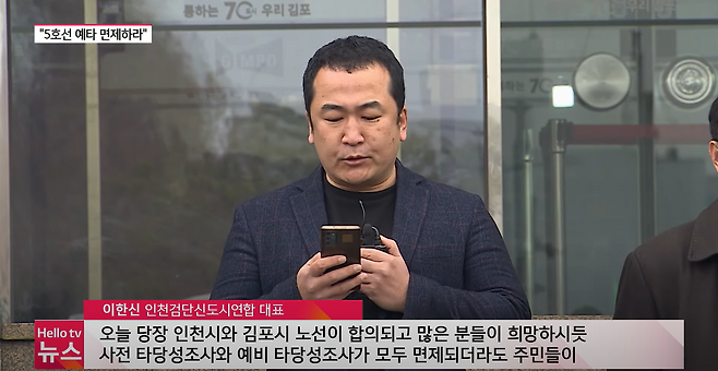 "오늘 당장 인천시와 김포시의 노선이 합의되고 많은 분들이 희망하시듯이 사전 타당성조사와 예비 타당성조사가 모두 면제되더라도 주민들이 5호선을 타기 위해서는 공사 기간, 설계, 행정 기간을 모두 포함해 최소 7년이 걸립니다."