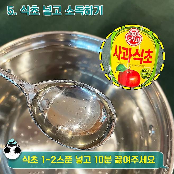 냄비의 3/4 정도가 차게 물을 붓고 식초를 1~2숟가락 넣은 후 10분간 팔팔 끓여서 살균 소독해 주면 된답니다.