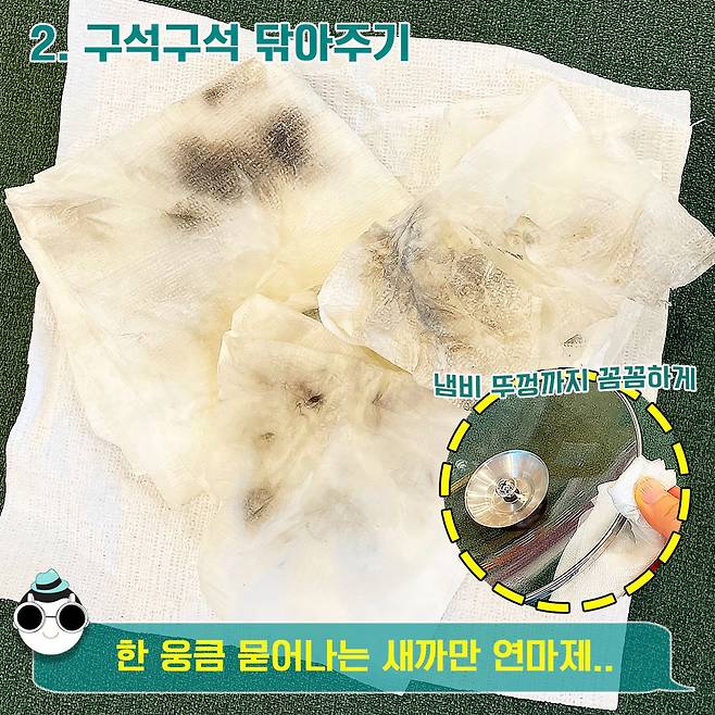 냄비 안팎으로 구석구석 식용유에 묻힌 타월로 잘 문질러 세척해 주세요. 특히 냄비의 굴곡진 부분이나 뚜껑 등에서 더 많이 묻어나기 때문에 이런 쪽을 잘 닦아 주는 게 포인트랍니다!