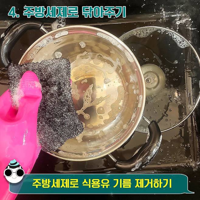 네 번째 단계는, 주방 세제로 처음 연마제 닦을 때 묻어난 식용유의 기름을 뽀득뽀득 닦아주는 거랍니다.