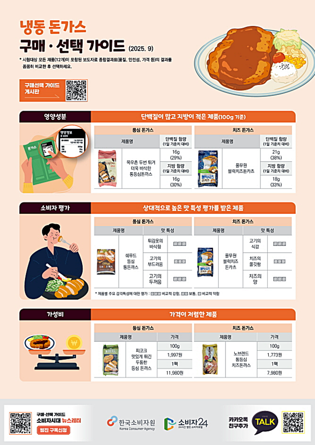 가격이 저렴하고 조리가 간편한 에어프라이어용 냉동 돈가스가 인기를 얻고 있는 가운데 제품에 따라 지방·단백질 함량은 최대 1.5배, 가격은 1.6배 차이 나는 것으로 나타났다.