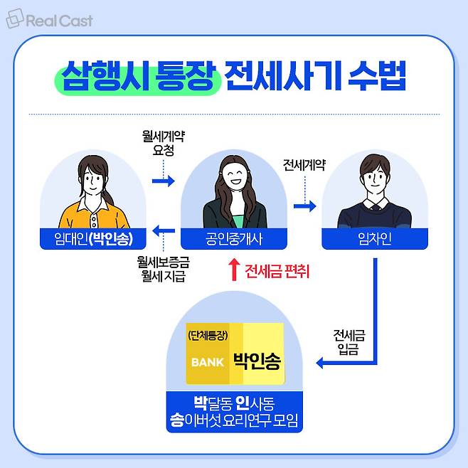 최근 전세시장에서는 소위 ‘삼행시 통장’이 큰 논란이 되었습니다. 특정 인명을 가장한 단체통장이 전세사기에 활용된 건데요. 조심성 있는 소비자도 깜빡 속을 수밖에 없는 교묘한 수법이었습니다.