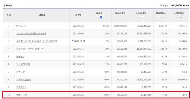 올해 최고의 기대작 중의 하나인 콤 베어리드 감독의 <말없는 소녀>가 개봉 첫날 전체 예매율 10위로 등극하며 흥행 돌풍을 예고하고 있다. 영진위 통합전산망에 따르면 현재 <말없는 소녀>는 1490명의 관객이 예매를 한 상태이며 예매율 0.2%를 기록(2023년 5월31일 기준)하며 <드림팰리스>에 이어 10위에 랭크되어 있다. 이것은 놀라운 결과라고 할 수 있다. 기대작에 부응하지 못하는 52개의 상영관수와 프라임 타임에 상영을 배정받지 못한 불리한 조건에서 선전한 결과이기 때문이다.