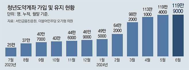 그러나 일각에서는 금융위가 계좌 가입 수요를 지나치게 낙관적으로 전망해 해당 사업 예산을 과하게 책정했다는 비판도 나온다. 국회예산정책처는 ‘2023 회계연도 결산’ 보고서에서 “(금융위는) 매달 15만 명이 신규 가입하고 청년희망적금 만기 가입자의 약 78%(145만 명)가 청년도약계좌로 갈아탈 것이라 가정했다”며 “이를 바탕으로 산정한 정부의 기여금 소요 금액에 대해 재검토가 필요하다”고 지적했다. 실제로 청년도약계좌 출시 직후인 지난해 7월 신규 가입자는 25만3000명이었지만 8월 12만5000명, 9월 4만4000명으로 금융위의 예측과 달리 신규 가입자 수는 일찌감치 큰 폭으로 감소했다.