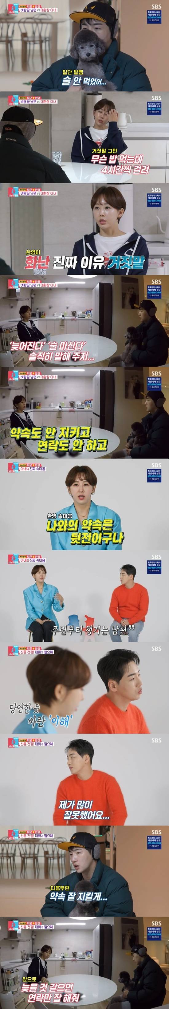 한영은 "2시간 만에 오기로 했잖아. 무슨 밥 먹는데 4시간이 걸리느냐. 술 마시는 거 자체를 뭐라 하는 건 아니다. 나한테 '지금 가', '술은 안 마셨어' 이런 거짓말은 하지 말아야지. '좀 늦어진다', '술 마신다'고 솔직히 말해 주지. 난 기분 나쁘다. 왜 나한테 한 말을 안 지키지? 내가 하는 말을 무시하는 건가? 싶다"고 말했다.