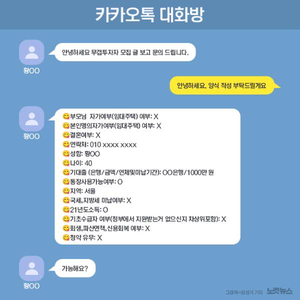 "신용불량자도 가능하나요?" 28살 남성에게도 연락이 왔다. 직업이 없고 한 번씩 일용직으로 일하러 나간다는 이 남성은 "돈이 너무 급하다"며 수수료 지급을 독촉했다. 그 또한 명의대여가 3번째라고 밝혔다.