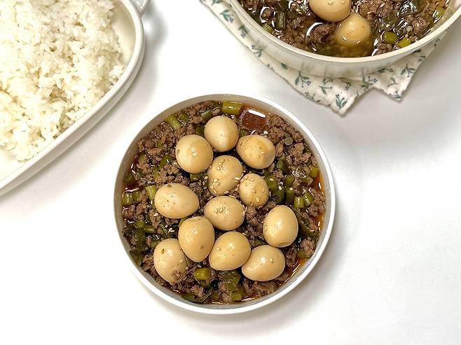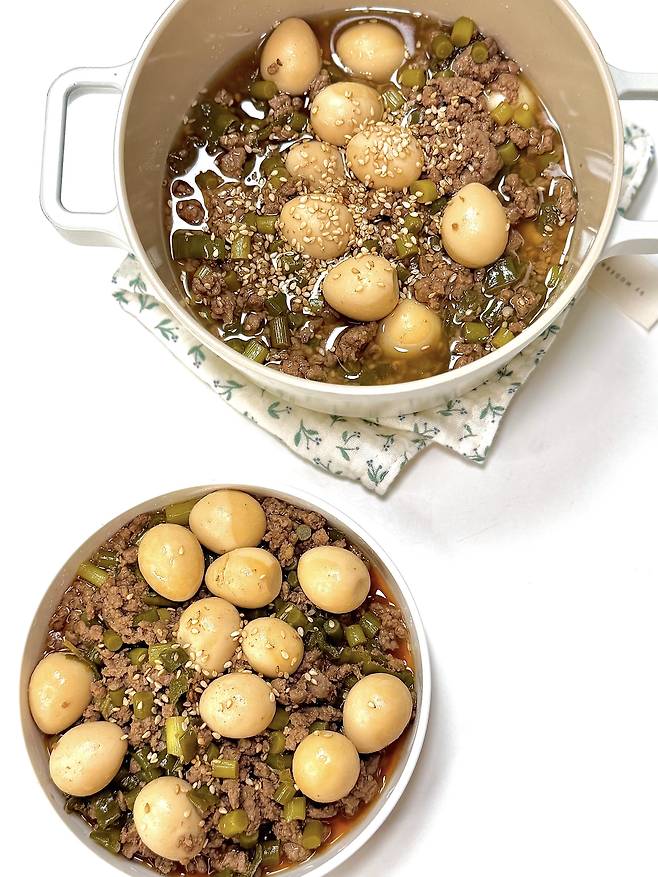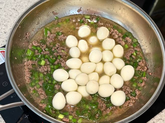 🥬 재료 : 소고기다짐육 200g, 마늘쫑 100g, 꽈리고추 6개, 버터 2조각 (약 20g), 메추리알 270g, 물 300ml, 간장 5, 맛술 2, 참치액젓 2, 굴소스 2, 설탕 2
