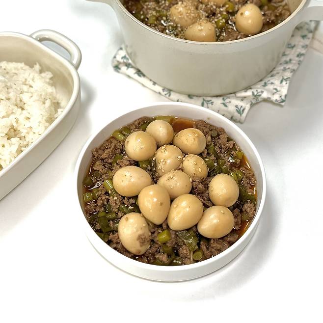 5️⃣ 물 300ml, 메추리알 270g도 같이 부어주세요.