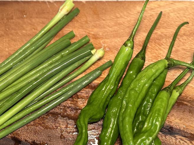 1️⃣ 마늘쫑 100g, 꽈리고추 6개 준비했고요. 각각 먹기 좋게 자잘하게 썰어줬어요.