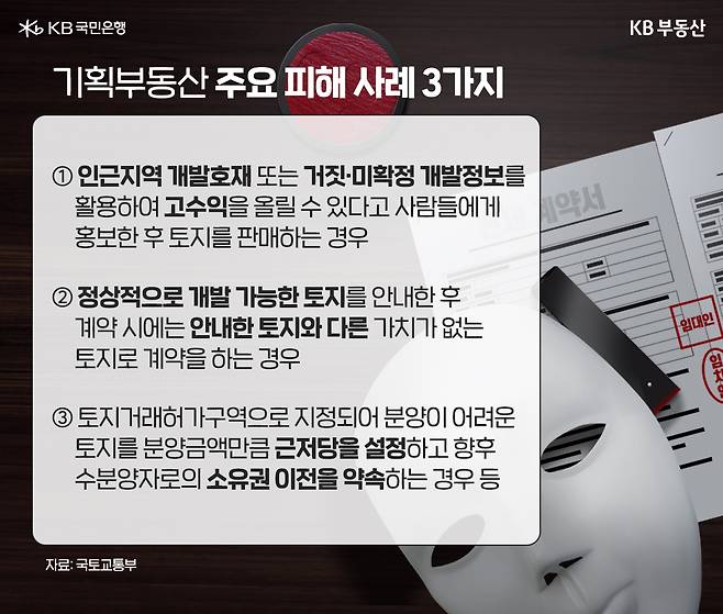 개발가능성 없는 토지를 지분으로 쪼개 고가에 판매하는 기획부동산 관련 피해가 여전히 심각한 것으로 나타났습니다. 이에 KB부동산에서 최근 국세청이 밝힌 기획부동산 사기 사례들을 살펴보고 피해를 줄이는 체크리스트 등을 살펴봤습니다.