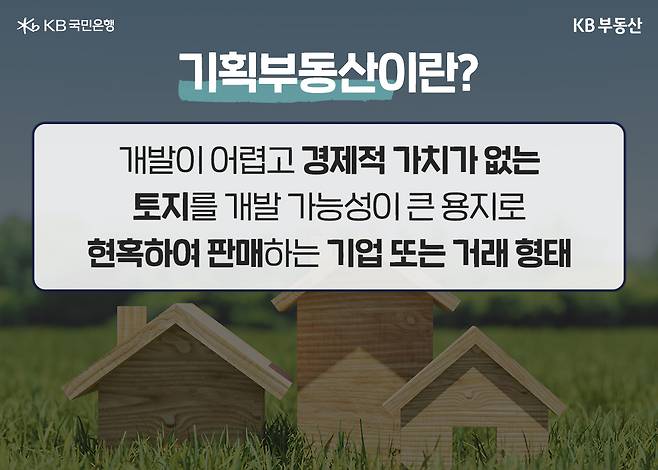 기획부동산은 일반적으로 개발이 어렵고 경제적 가치가 없는 토지를 개발 가능성이 큰 용지로 현혹하여 판매하는 기업 또는 거래 형태를 의미합니다. 언론에서 부동산 투기 및 사기와 관련한 보도에 ‘기획부동산’이란 용어를 사용하던 것이 일반적으로 통용되기 시작한 것이죠.