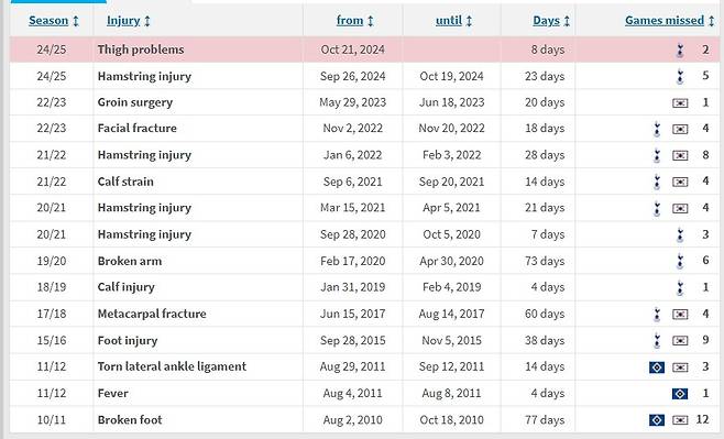 올 시즌 들어 손흥민의 부상이 늘어났다. 손흥민은 2010~2011시즌 프로 데뷔했다. 지난 시즌인 2023~2024시즌까지 14번의 시즌동안 13번 다쳤다. 총 378일을 쉬었다. 60경기에 결장했다. 한 시즌으로 치면 부상으로 평균 27일, 그리고 4.2경기에만 나서지 못했다. 장기 부상은 없었다. 꾸준히 경기에 출전했다. 안면 골절이 온 상황에서도 특수 마스크를 쓰고 뛸 정도였다.