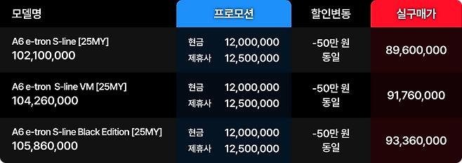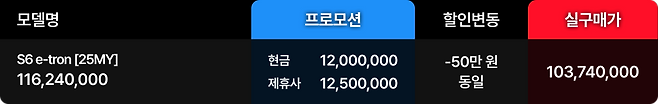 이번 4월 조건에서 또 하나 눈여겨볼 부분은 A6입니다. 전동화 모델인 A6 e-트론은 여전히 혜택이 유지됩니다. A6 e-트론 어드밴스는 9459만 원에서 1150만 원 할인으로 8209만 원, 어드밴스 디스플레이 트림은 9592만 원에서 8342만 원, 상위 사양은 9808만 원에서 8558만 원 수준입니다. S-line 트림도 1억210만 원에서 8960만 원, 상위 구성은 9176만 원, 블랙에디션은 9336만 원으로 조정됩니다. S6 e-트론 역시 1억1624만 원에서 1억374만 원 수준까지 내려옵니다.