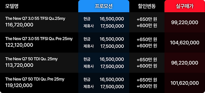 이번 프로모션이 흥미로운 이유는 Q5에만 힘이 실린 것이 아니라는 점입니다. 대형 SUV인 Q7과 Q8도 할인 폭이 크게 확대되면서 소비자 체감 가격을 낮췄습니다. Q7은 현금 기준 1650만 원, 제휴사 기준 최대 1750만 원 혜택이 적용됩니다. Q7 55 TFSI 콰트로는 1억1672만 원에서 9922만 원, 프리미엄은 1억2212만 원에서 1억462만 원입니다. 디젤 모델인 Q7 50 TDI 콰트로는 1억1372만 원에서 9622만 원, 프리미엄은 1억1912만 원에서 1억162만 원입니다.