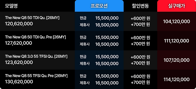 Q8도 마찬가지입니다. Q8 50 TDI 콰트로는 1억2062만 원에서 1억412만 원, 프리미엄은 1억2762만 원에서 1억1112만 원입니다. 가솔린 Q8 55 TFSI 콰트로는 1억2362만 원에서 1억712만 원, 프리미엄은 1억3062만 원에서 1억1412만 원으로 내려옵니다. 한편 법인 구매 시에는 추가 할인과 취등록세 지원까지 가능해 실제 체감 조건은 더 좋아질 수 있습니다.