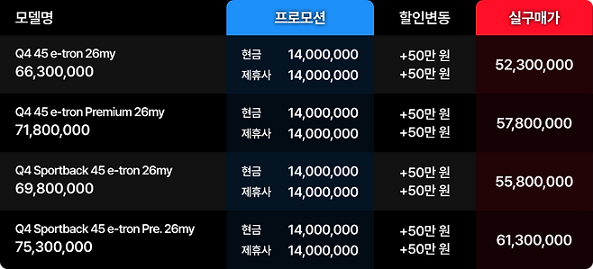 전기차 쪽에서는 Q4 e-트론이 가격 경쟁력으로 다시 존재감을 드러냅니다. Q4 45 e-트론은 6630만 원에서 5230만 원, 프리미엄은 7180만 원에서 5780만 원, 스포트백은 6980만 원에서 5580만 원 수준입니다. 최근 전기 SUV 시장이 테슬라와 일부 프리미엄 브랜드, 중국계 브랜드까지 섞여 치열해진 상황을 생각하면, Q4 e-트론의 이번 가격 조정은 다시 비교해볼 이유를 충분히 만들어줍니다.