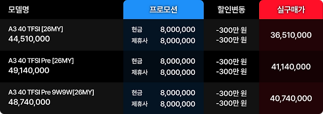 아우디 입문형 모델인 A3도 여전히 의미가 있습니다. A3 40 TFSI는 4451만 원에서 3651만 원, 프리미엄은 4914만 원에서 4114만 원, 일부 구성은 4074만 원 수준까지 내려옵니다. 콰트로 프리미엄 계열도 4368만 원, 4408만 원 선입니다. 최근 국산차 상위 트림 가격이 크게 올라간 상황을 생각하면, A3는 첫 수입차를 고민하는 소비자에게 여전히 꽤 현실적인 선택지로 보입니다.