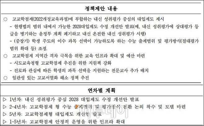 교육위는 현행법의 범위내에서 가능한 ‘2028 대입제도 수정 개선안’을 이재명 정부 1년차에 발표한다는 계획이다. 이어 2~4년차에는 고교학점제 형 수능 출제범위 및 평가 방식 전환 논의 착수 및 모델 마련에 들어간다는 방침이다. 5년차에는 고교학점제형 대입제도 개선안을 발표한다는 계획이다.