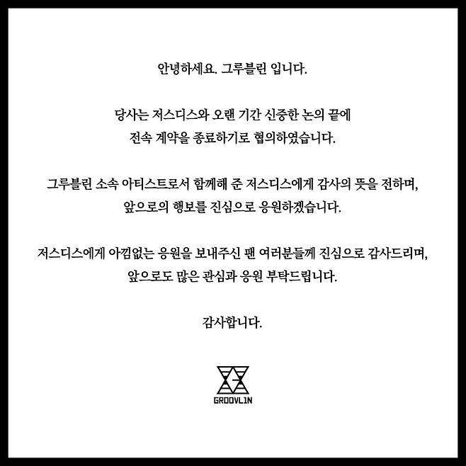 16일 소속사 그루블린은 "당사는 저스디스와 오랜 기간 신중한 논의 끝에 전속 계약을 종료하기로 협의했다"고 밝혔다.