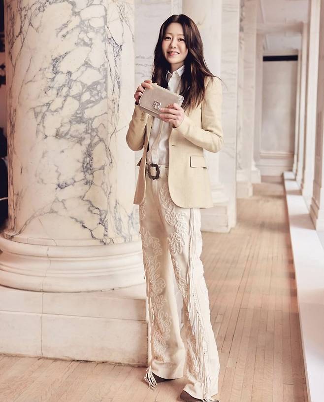 화이트와 베이지의 뉴트럴 톤 조합은 도시적이면서도 부드러운 분위기를 자아냈고, 여유 있는 실루엣의 팬츠와 구조적인 자켓이 고현정 특유의 고급스러운 이미지를 더욱 강조했다.