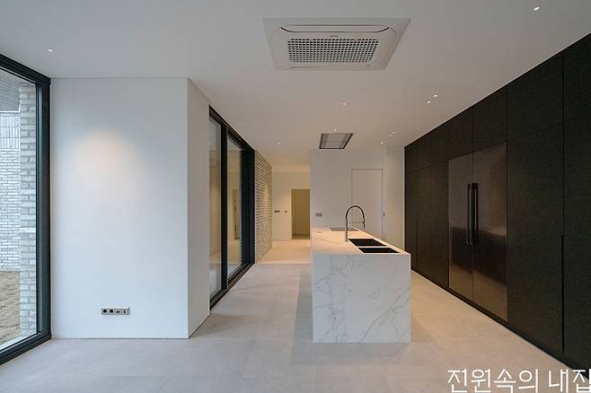 건축주는 ‘프렌치 모던(French Modern)’이라는 단어로 미적 선호를 표현했다. 여기에 하천리라는 지역적 맥락과 보편성을 더해 내외부에서 고전성(classic)과 현대성(modern)을 동시에 느낄 수 있는 건축적 언어와 재료, 디자인으로 풀어내고자 했다.