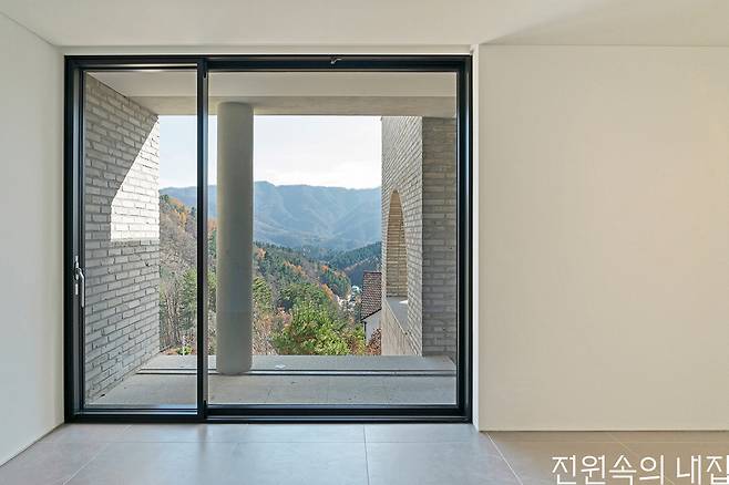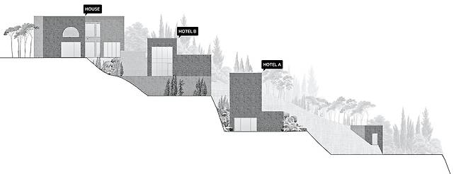 이번 프로젝트는 주택과 호텔이 프라이버시를 위해 서로 분리되면서도 관리를 위해 연계되고, 각 객실도 상황에 따라 독립과 공유를 유연하게 오가야 했다. 주택과 호텔의 시선은 서로 겹치지 않으면서도 수려한 자연경관을 충분히 감상할 수 있게 개방하고자 했다. 이에 호텔동들이 경사를 따라 순차적으로 쌓인 후 마지막에 얹어지는 주택 역시 두 레벨에서 대지와 만나며 지형에 순응하는 모습으로 계획되었다. 호텔의 객실 건물들은 서로 엇갈리게 쌓이고 창들은 서로 다른 풍경을 바라보게 디자인되었다.