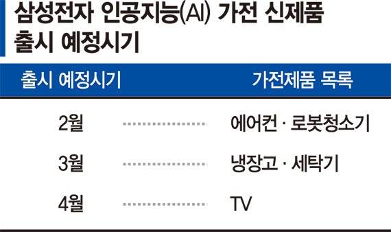 삼성전자가 최근 인공지능(AI) 에어컨을 출시한 데 이어 2월 중 로봇청소기, 3월에 냉장고·세탁기 등 가전, 4월에 TV까지 인공지능(AI) 가전 확대에 본격 나선다.