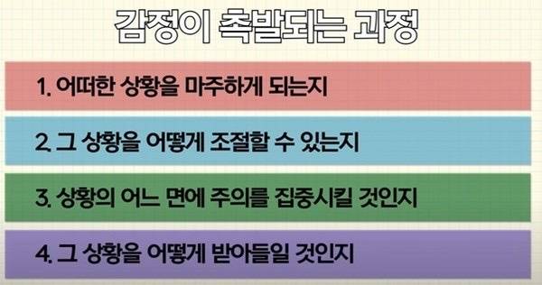 이처럼 감정을 단순히 드러내지 않는 것만으로는 성공적인 감정 조절이라고 할 수 없습니다. 관건은 ‘어떻게’ 감정을 조절해야 하는가에 달려 있기 때문입니다. Gross 박사는 감정을 억누르려는 노력보다는 감정을 일으키는 과정, 그 단계에 집중해야 할 필요가 있다고 이야기합니다.