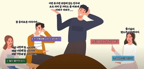 친구를 만나는 일 자체를 아예 피하거나(situation selection), 만난 자리에서 친구와 먼 곳을 찾아 간다거나(situation modification), 친구가 보이더라도 신경 쓰지 않으려고 노력하거나(attention deployment), 친구의 잘난 체하는 모습을 본다 하더라도 굳이 나쁘게만 바라보지 않고 다르게 생각(cognitive change)하려고 노력할 수 있습니다.
