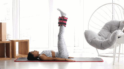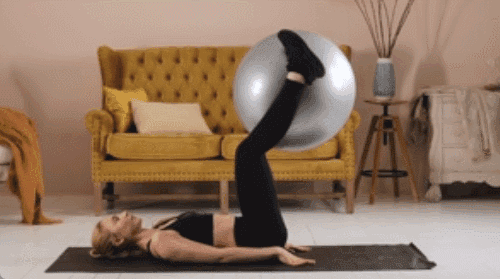 매트에 등을 대고 누운 뒤 다리 사이에 짐볼을 끼워 단단히 고정합니다. 다리를 공중으로 들어 올리며 복부에 힘을 주고 허리가 뜨지 않도록 유지합니다. 다리를 내렸다가 다시 들어 올리는 동작을 반복합니다.