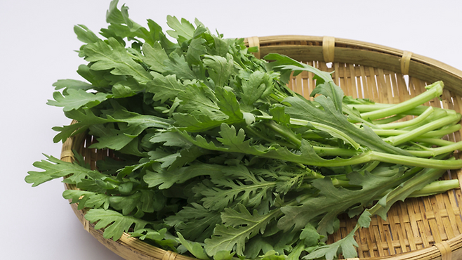 쑥갓은 100g당 26kcal로 열량 부담이 적은 봄나물이다. 비타민A를 비롯해 엽록소, 비타민B2, 칼슘이 들어 있어 환절기 영양 보충용으로 활용도가 높다.