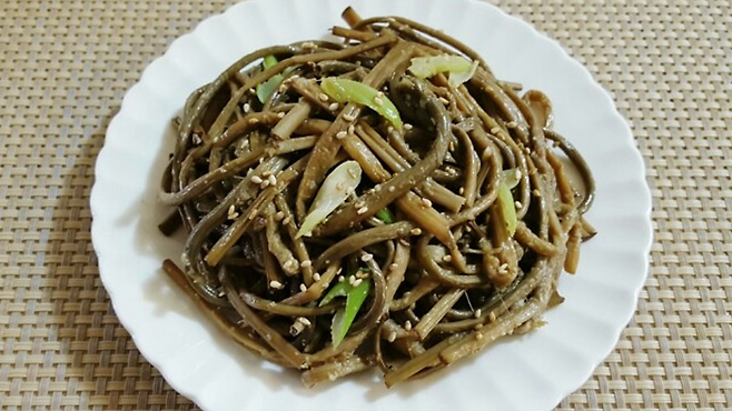 이후 들기름에 볶아 국간장과 다진 마늘로 간을 맞추고, 물을 자작하게 부어 약불에서 조리면 쫄깃한 식감이 살아난다.