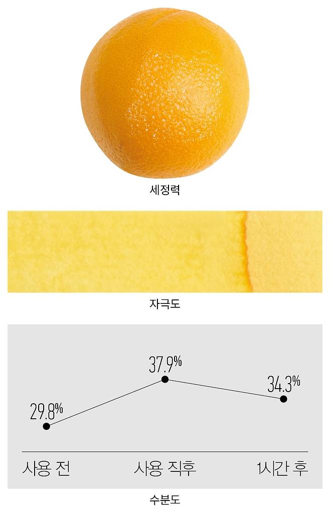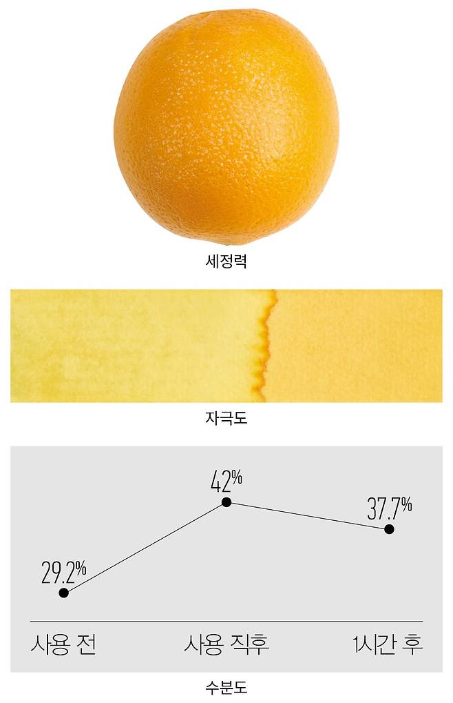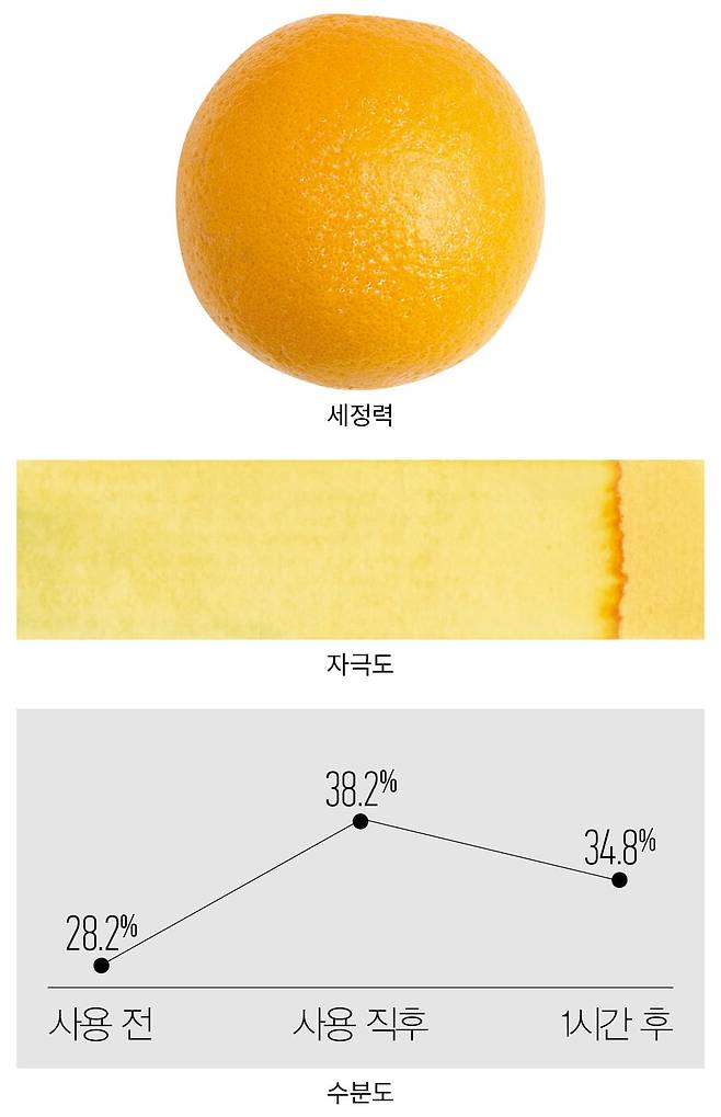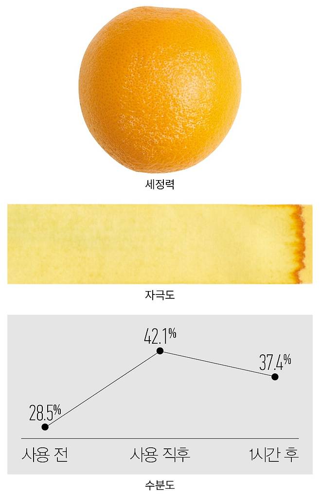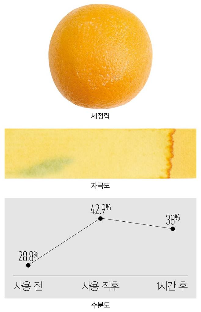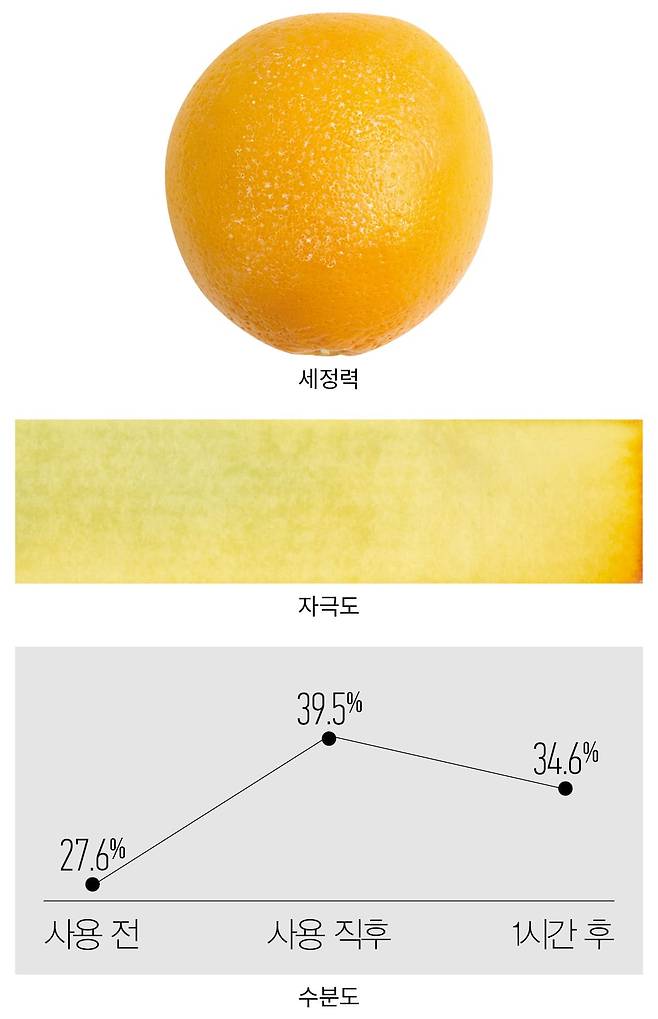 방법 오렌지에 흰색 잉크를 바르고 제품을 사용해 씻어낸 뒤 잔여물을 확인한다.