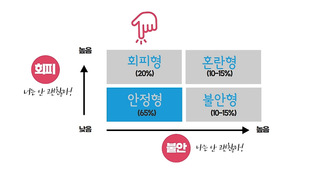 불안정 애착에도 다양한 종류가 있습니다. 내 애착 유형이 무엇인지 테스트를 통해 제대로 알아봐요. 대부분의 사람들은 타고난 애착 유형을 그대로 유지하며 살지만, 4명 중 1명은 애착 유형의 변화를 만들어 냅니다. 변화를 만들고 싶은 상위 30%가 되고 싶은 분들이라면 전문가와 함께하는 애착 솔루션 클래스를 추천드립니다.