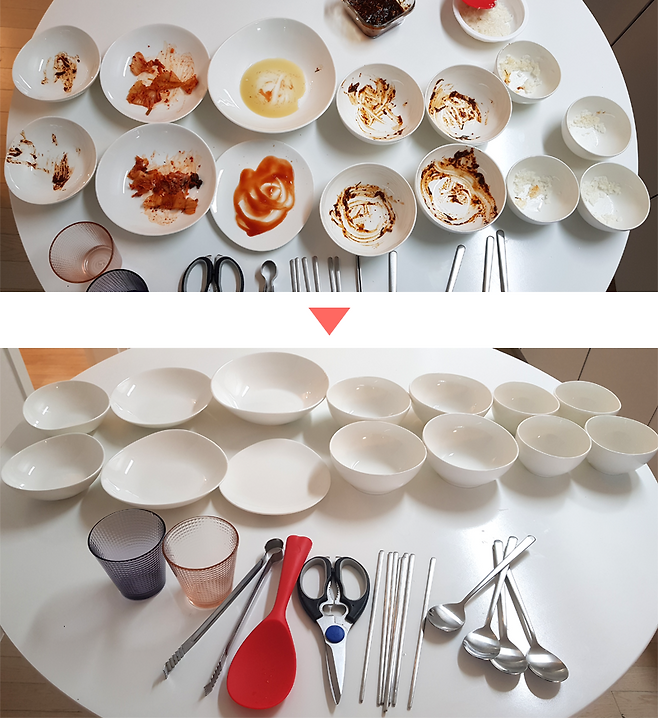 세제를 사용하지 않고, 물로만 간단히 1차 세척을 해줘도 식기세척기를 거치면 훨씬 간편하게 훌륭한 설거지가 가능해집니다.