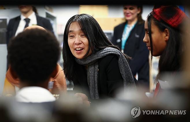 (스톡홀름=연합뉴스) 김도훈 기자 = 2024 노벨문학상 수상자인 한강 작가가 11일(현지시간) 스웨덴 스톡홀름 외곽에 위치한 린케뷔 도서관에서 열린 노벨문학상 기념책자 낭독회에서 현지 다문화 학교 학생들과 이야기를 나누고 있다. 2024.12.11