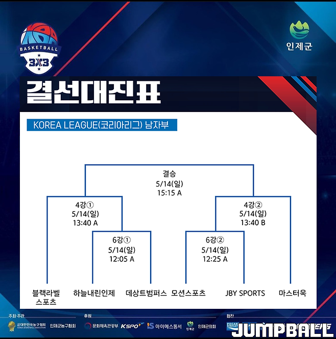 코리아리그 남자부 결선은 예선이 마무리된 후 추첨을 통해 대진이 결정됐다. 블랙라벨스포츠와 마스터욱이 4강에 직행한 가운데 6강 대진은 하늘내린인제-데상트범퍼스, 모션스포츠-JBY SPORTS로 결정됐다.