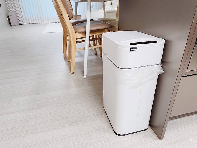 가장 휴지통을 많이 사용하는 공간인 주방에 두고 사용 중인 모션 센서 휴지통이에요. 센서 휴지통은 건전지식도 있고, 충전식도 있는데 저는 건전지식을 더 선호해요.