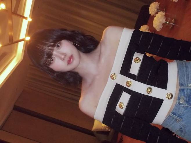 그녀가 선택한 상의는 블랙과 화이트가 배색된 오프숄더 니트 가디건으로, 골드 버튼 디테일이 포인트다. 어깨선을 드러낸 실루엣은 우아함을 강조하며, 넓은 넥라인과 세로 스트라이프는 상체 라인을 보다 길고 슬림하게 연출해준다. 여기에 연청 데님 팬츠를 매치해 클래식하면서도 캐주얼한 무드를 완성했다.