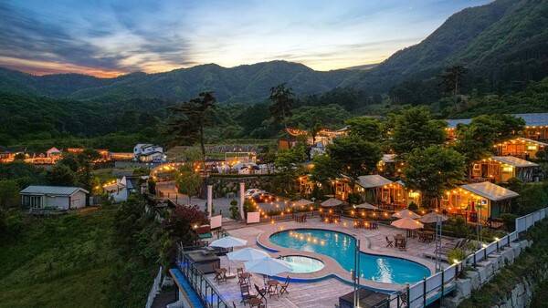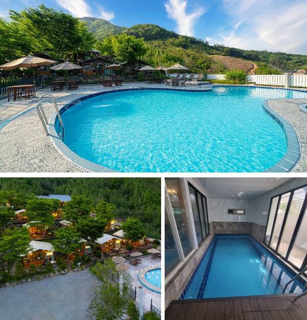 풀빌라 내부 수영장도 규모가 큰 편이라 성인도 충분히 물놀이가 가능하다는 점이 특징입니다. 이곳에는 풀빌라뿐만 아니라 스파, 글램핑 등 다양한 객실도 함께 운영하고 있는데요.