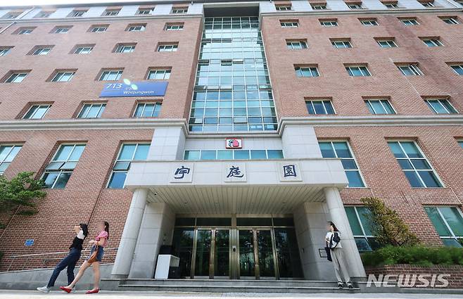 [서울=뉴시스] 김근수 기자 = 21일 오전 서울 서대문구 연세대학교 신촌캠퍼스 학생 기숙사 우정원에서 기숙사 학생들이 오가고 있다.