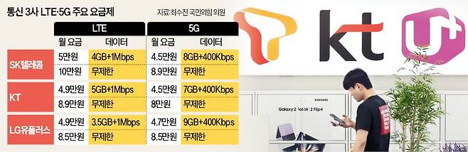KT의 LTE 대상 ‘톡 플러스’ 요금제는 월 4만9000원에 5GB를 쓸 수 있다. 반면 ‘5G 슬림 4G’는 1만2000원 싼 3만7000원에 4GB를 준다. LG유플러스도 LTE 4만9000원 요금제는 3.5GB를 주는 반면 5G 요금제는 3만7000원에 5GB를 제공 중이다.