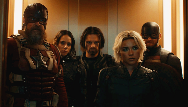 '썬더볼츠*'는 옐레나 벨로바(플로렌스 퓨), 윈터 솔져(세바스찬 스탠), 레드 가디언(데이비드 하버), U.S. 에이전트(와이어트 러셀), 고스트(해나 존-케이먼), 태스크마스터(올가 쿠릴렌코) 등 MCU에서 한 가닥 했던 '빌런' 혹은 문제적 인물들을 한자리에 모았다. 이들의 조합은 신선하고 흥미롭지만, 팀을 결성하고, 갈등을 겪고, 결국에는 하나가 되어 위기를 극복하는 이야기는 기존 팀업 무비의 클리셰를 크게 벗어나지 않는다. 그점에서 보면 이제는 시리즈가 끝난 '가디언즈 오브 갤럭시'를 떠올리게 한다. 루저들과 같은 문제적 인물들이 팀을 이루는 이야기를 기대했다면 '썬더볼츠*'는 그 기대감에 충분히 부응한다.